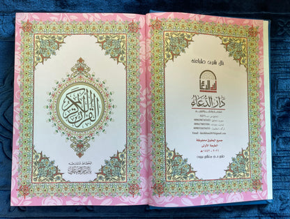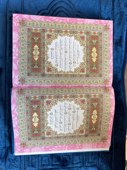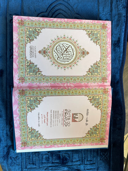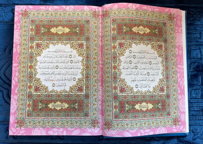 Rainbow Qur’an, this edition features distinct colour themes inside the Qur’an, where the page background and decorative borders change colour as you progress through different sections of the Mushaf. The Arabic text remains clear and traditional, making it easy to read while adding a visually engaging experience.