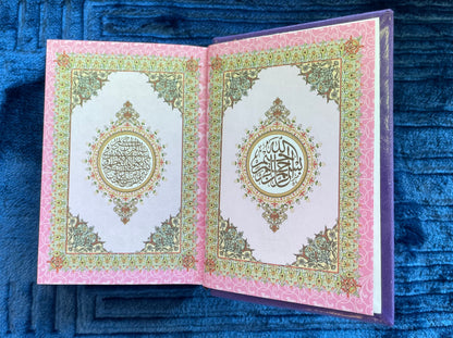Rainbow Qur’an, this edition features distinct colour themes inside the Qur’an, where the page background and decorative borders change colour as you progress through different sections of the Mushaf. The Arabic text remains clear and traditional, making it easy to read while adding a visually engaging experience.