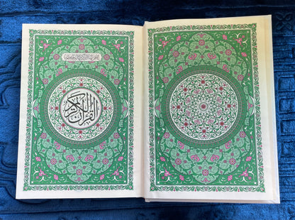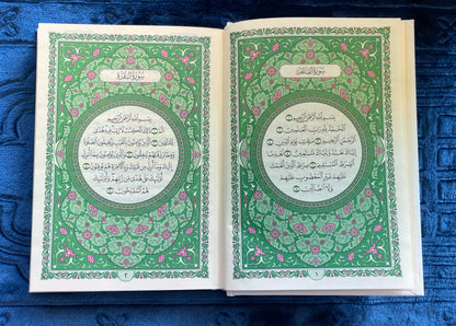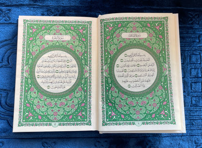 The Mushaf features decorative green floral pages, with Surahs presented inside circular and framed layouts on opening sections, followed by clear, traditional Arabic text for comfortable daily recitation.