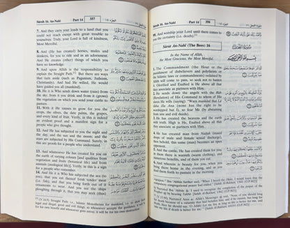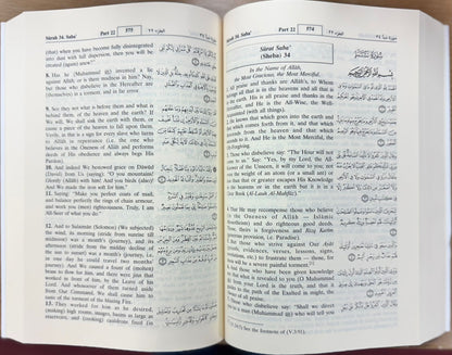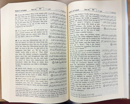 This Mushaf offers the original Arabic script in Uthmani print and the corresponding English translation on facing pages, with the Tafsir appearing as footnotes for easy cross-reference and deeper study.