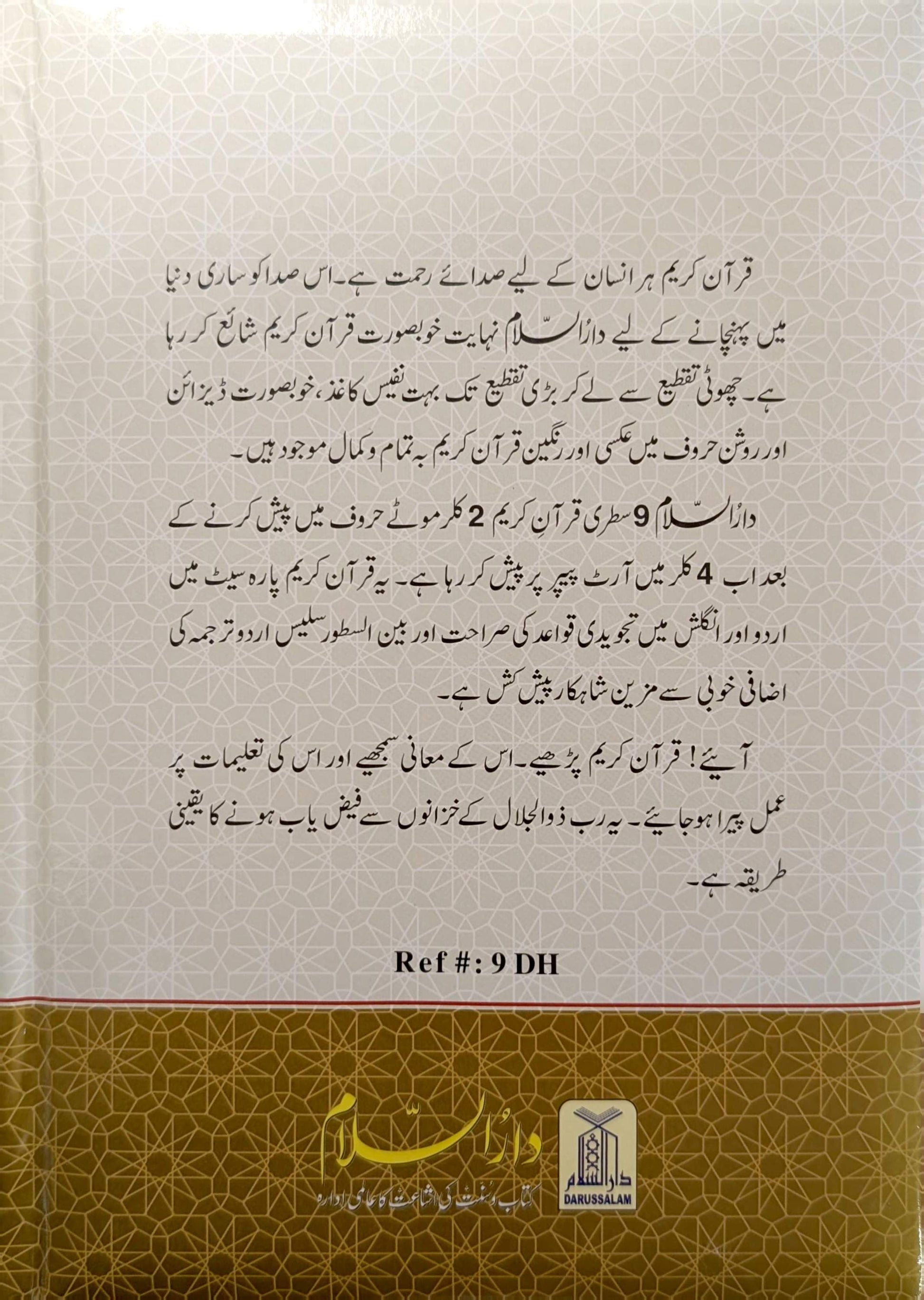 ۹ لائن تجویدی قرآن اردو ترجمہ کے ساتھ (۲ جلدیں) خاص طور پر اس انداز میں تیار کیا گیا ہے کہ قاری قرآن پاک کی درست قراءت کے ساتھ اس کا مفہوم بھی سمجھ سکے۔ اس میں عربی متن واضح اور موٹے حروف میں ہے جبکہ تجویدی قواعد رنگوں کے ذریعے نمایاں کیے گئے ہیں، جس سے درست تلفظ آسان ہو جاتا ہے۔