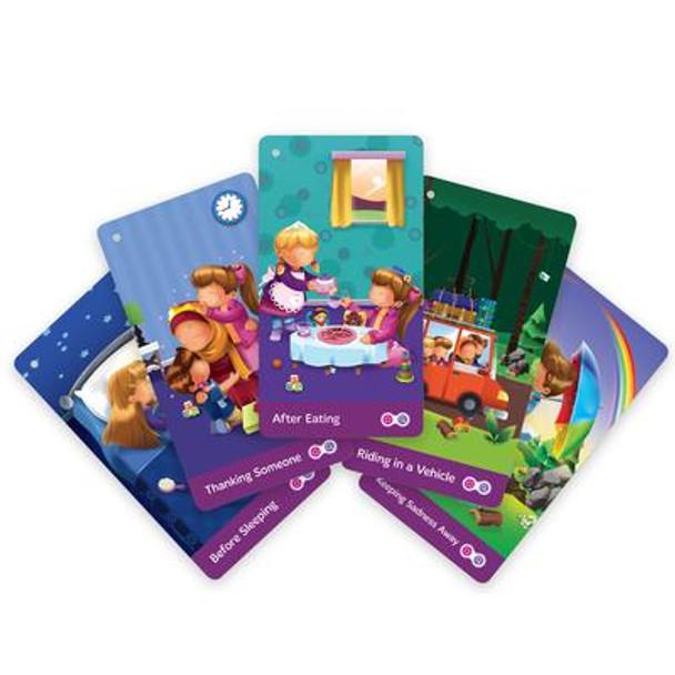 Each card contains a colorful illustration on one side and text (Arabic with English translation) on the other side.