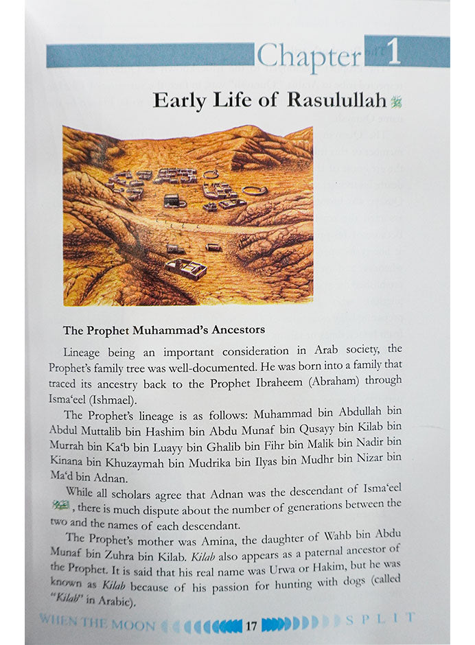 "When the Moon Split" is a short but beautiful account of the life and times of our Holy Prophet Muhammad (P.B.U.H.) in which you will learn about how he got chosen by Allah S.W.T., how he responded to the call, and how he (P.B.U.H.) spread the message of Islam throughout the world while facing all the challenges and hardships along the way.